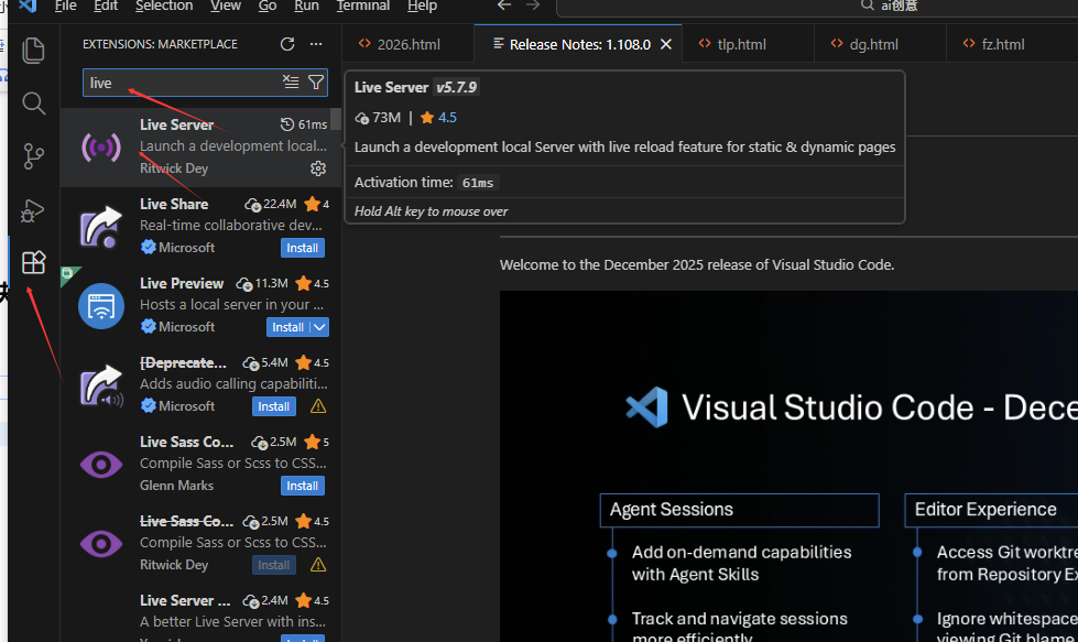 四、安装 VSC 后再安装插件 live server